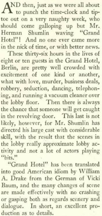 Grand Hotel opened at the National Theatre on Nov. 13, 1930 to strong reviews, including the one below by Robert Benchley that he filed for The New Yorker. The play, adapted from the 1929 novel Menschen im Hotel by Austrian writer Vicki Baum, would prove to be a smash on Broadway and again on the silver screen in a star-studded 1932 film featuring Greta Garbo, John Barrymore, and Joan Crawford.