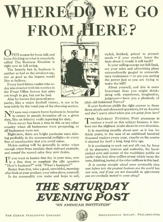 Occasionally advertisements acknowledged the reality of the Great Depression, including this one from The Saturday Evening Post that offered encouraging words to prospective readers…