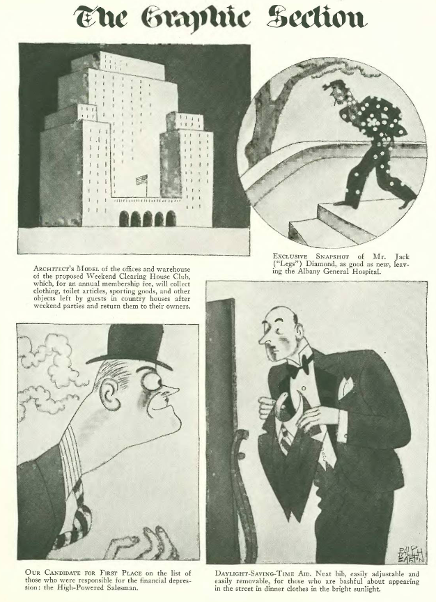 He was a prominent contributor to the magazine, from recurring features like his weekly take on the news—”The Graphic Section”—to theatrical caricatures that included clever caption-length reviews. He was married four times in his short life, most notably to actress Carlotta Monterey, his third (he was also her third marriage). She divorced Barton in 1926 and married playwright Eugene O’Neill in 1929.
