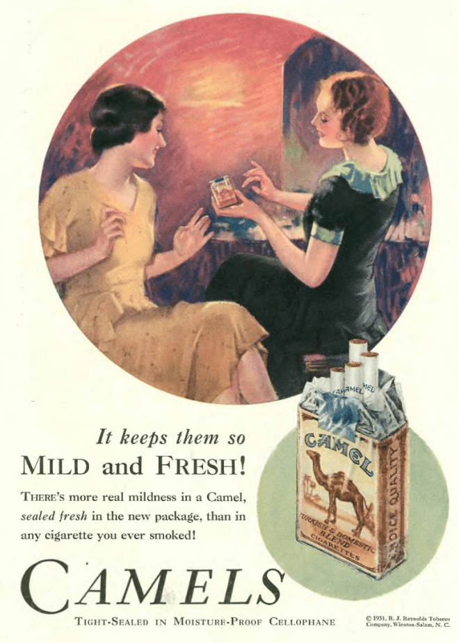 …R.J. Reynolds continued to market Camel cigarettes to women, but the ads moved away from illustrations of Continental leisure and instead emphasized the freshness of the product, thanks to the cellophane-wrapped “Humidor pack”…