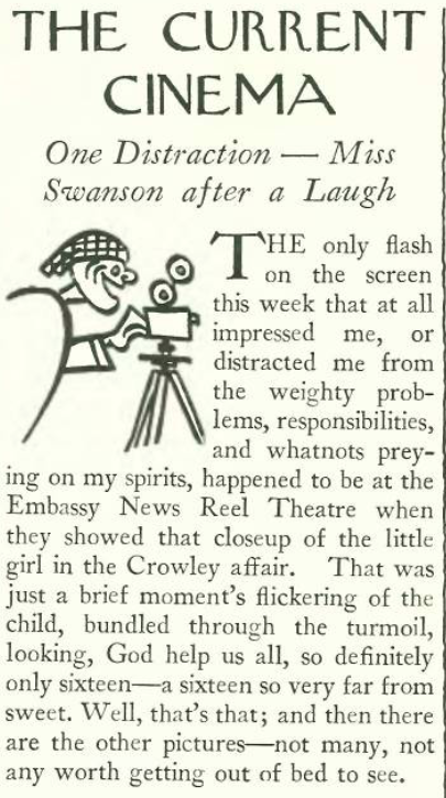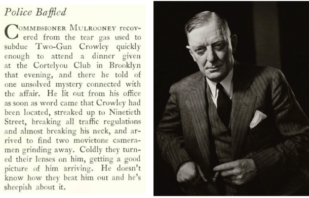 Another mention of the incident was in John Mosher’s film review column. He noted that the newsreel footage of the shoot-out was the best thing on the screen that week, and especially the moment when Crowley’s 16-year-old girlfriend Helen Walsh emerged from the building in the clutches of the police: