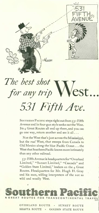 …Southern Pacific used a theme (illustrated by Don Harold) to promote travel on their trains that wouldn’t fly today…
