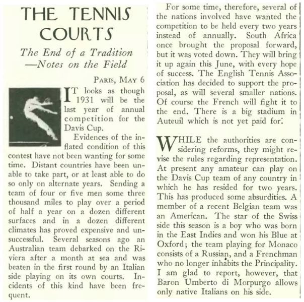 Eighty years ago sportswriter John Tunis declared that the Davis Cup international tennis competition would likely come to an end due to expense and the erosion of amateur play. Well, we know the Davis Cup is still around, and one wonders if Tunis was getting a whiff of sour grapes, since the French had won the cup five years straight, and would win again in 1932.
