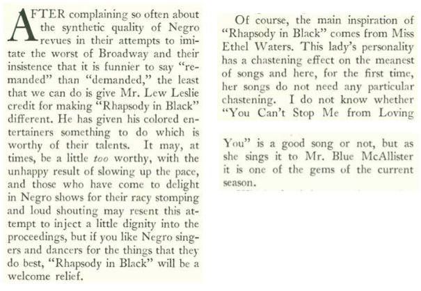 In spring 1931 Dorothy Parker subbed as theatre critic for her friend, Robert Benchley, and was greeted with a remarkably mediocre (or worse) line-up of shows. When Benchley returned to his post, things didn’t get much better until Rhapsody in Black came along with its inspiring star, Ethel Waters.