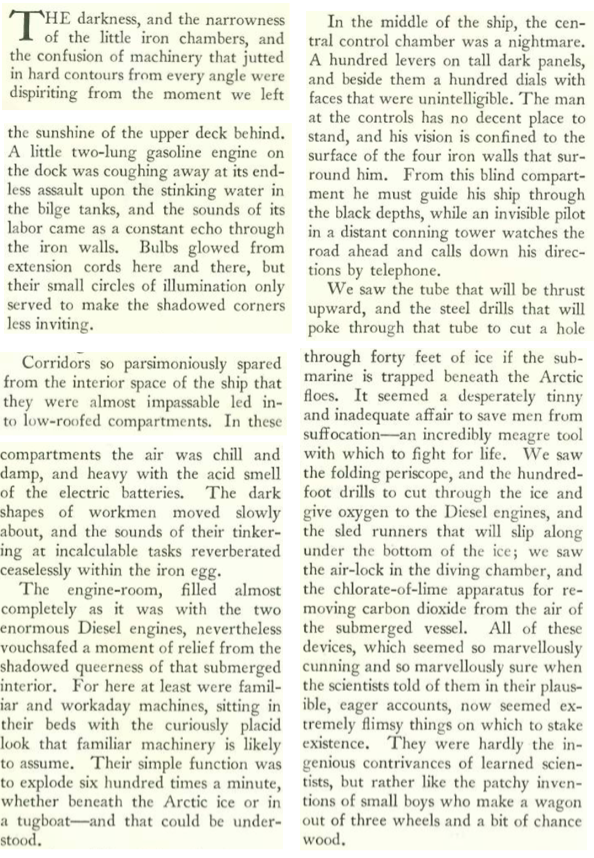 In his “Reporter at Large” column, Morris Markey paid a visit to the Brooklyn Navy Yard where Sir Hubert Wilkins and his crew were busy preparing a narrow, cramped submarine dubbed Nautilus for a trip beneath the ice of the North Pole. Markey marveled at all of the complicated devices crammed into the vessel, but at the same time wondered why anyone would stake their life on “such flimsy things”…