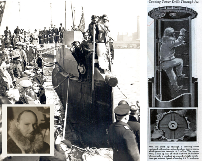 DRY DOCK…Christened with a bottle of ice water rather than Champagne thanks to Prohibition, the Nautilus expedition, led by Sir Hubert Wilkins (inset), had to overcome many obstacles to reach the North Pole, including untested equipment such as a conning tower (right) designed to drill through ice to allow crew members to reach the surface of polar ice. (amphilsoc.org)