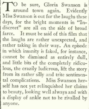 To be fair, Gloria Swanson was only 32 years old in 1931, but she was so deeply associated with the silent era that by the 1930s she seemed positively ancient (a status that she would brilliantly use to her advantage in 1950’s Sunset Boulevard). Mosher offered this “meh” review of her latest work — only her second completely-sound film — Indiscreet.