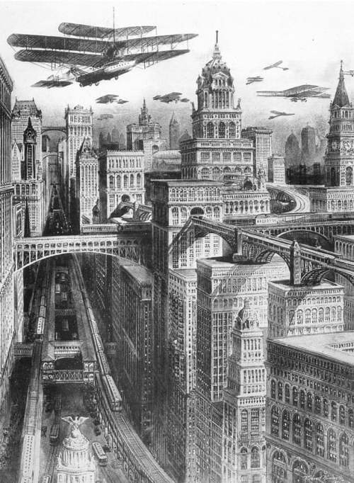 AND THEY LAND WHERE?…The idea of city skies filled with flying commuters is nothing new, as this 1911 illustration by Richard Rummell from King’s Views of New York attests. (The Guardian)