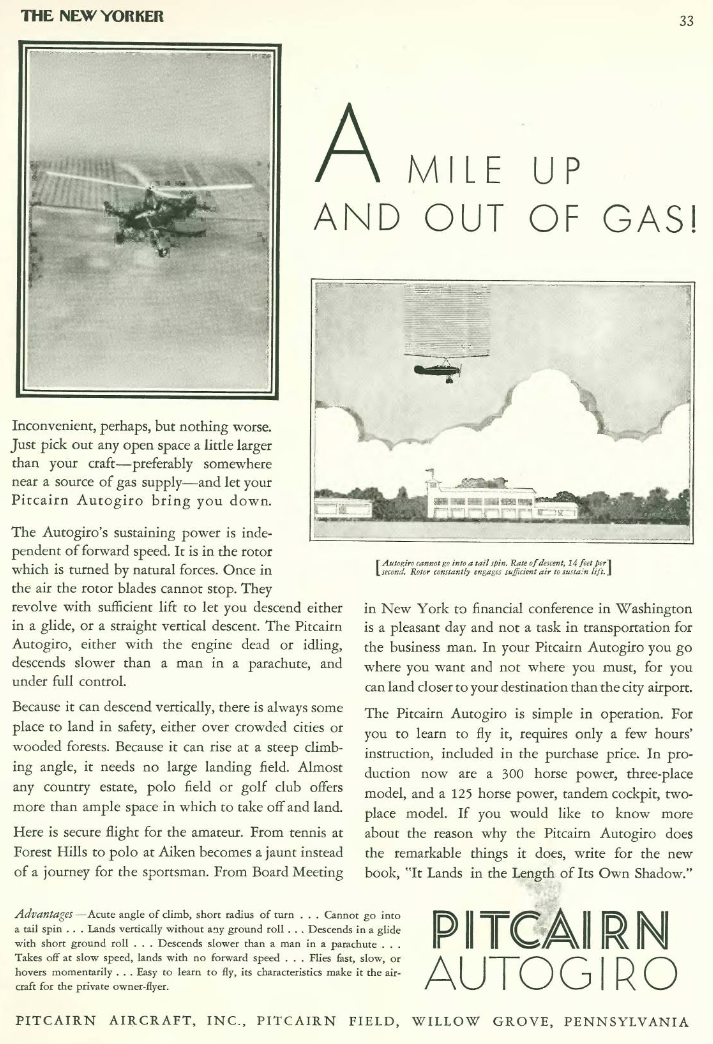 In the article, White referenced this Pitcairn Autogiro ad from the April 25, 1931 issue. No doubt the folks at Pitcairn had the Rockne accident in mind when they touted the safety of their craft, which seemed impossible to crash.