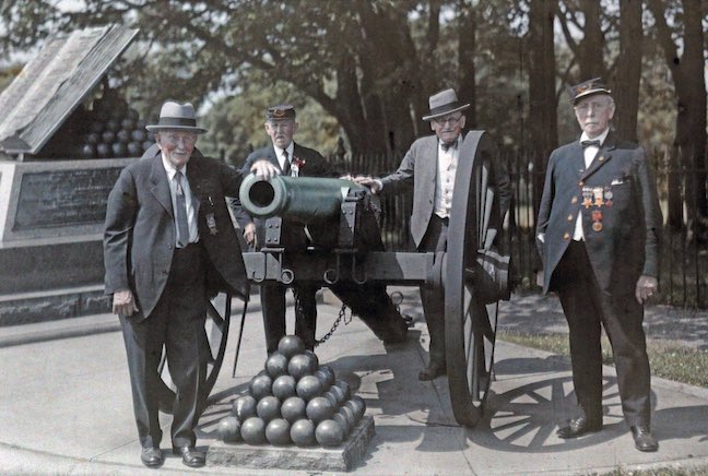 OLD WARRIORS…Union Civil War veterans stand in front a monument at Gettysburg, July 12, 1931. (National Geographic)