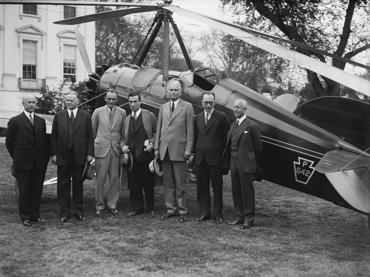 PHOTO OP…A Pitcairn PCA-2 Autogiro paid a visit to the White House on April 22, 1931. President Herbert Hoover is second from left. (Library of Congress)