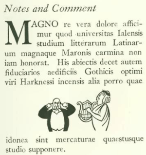 One more from E.B. White, this the lead item for his column which made jest of a debate at Yale over dropping the requirement for Latin. It says something to the effect that “Yale’s lead on the issue frees the rest of us to follow our fiduciary duty, toss tradition into the fire, and focus on practical matters such as traffic studies.”