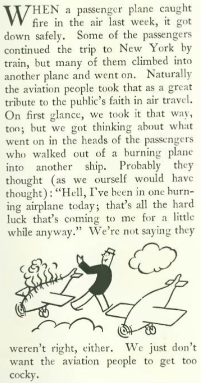 A few posts ago (the April 11 issue) I wrote about E.B. White’s love of flying, and how his (and the nation’s) exuberance for aviation suddenly came crashing down along with Knute Rockne’s plane in a Kansas wheat field.
