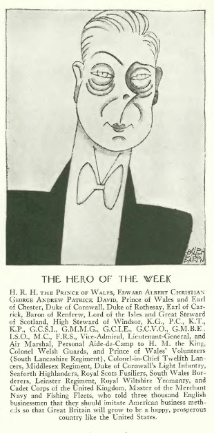 …and we end our May 23 cartoons on a sad note, with Ralph Barton’s final contribution to The New Yorker, a “Hero of the Week” illustration featuring the Prince of Wales: