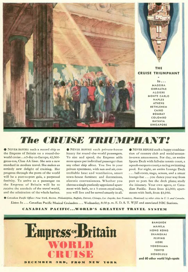 …and you might have packed a Jantzen or two for this around-the-world cruise on the Empress of Britain, arranged through Canadian Pacific. Your fare, if you wanted an “apartment with a bath,” would set you back $3,950, or a cool $63,000 in today’s currency…