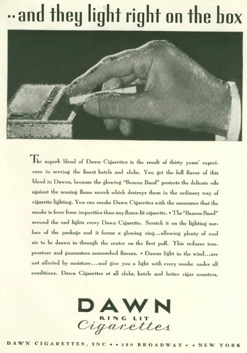 The makers of Dawn “Ring-Lit” cigarettes seemed to have a winner on their hands with a smoke you could light like a match, but I can’t find any record of the company. Most likely this was a local brand sold at nightclubs, restaurants and hotels, and not through retail…