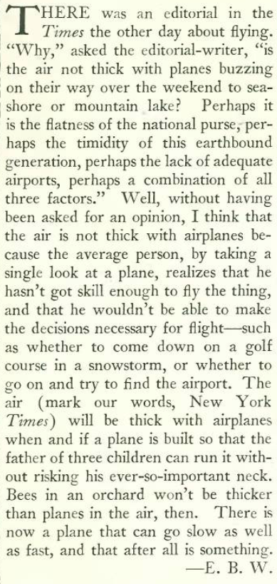 Prompted by a New York Times editorial, White pondered the day when the air would be thick with personal aircraft: