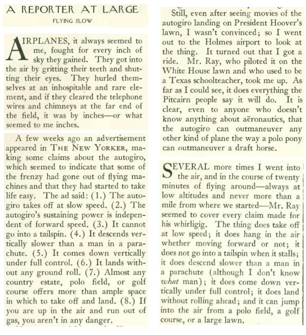 On a windy day White boarded the autogiro at an airport “in awful Queens” — most likely the current site of La Guardia — and filed this report for the “A Reporter at Large” column: