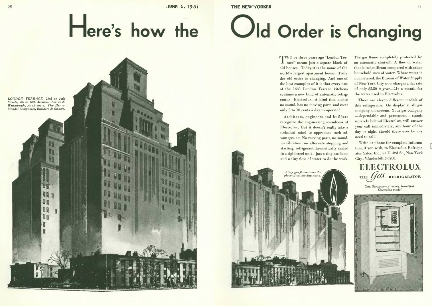…Walking east on 24th Street past Chelsea’s London Terrace and on to Madison Square Park is one of my favorite strolls in Manhattan…there is something almost cozy about walking by this massive building, once the largest apartment house in the world…Electrolux found it impressive enough to pair it with their latest model refrigerator…