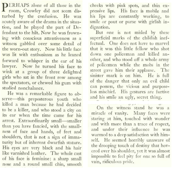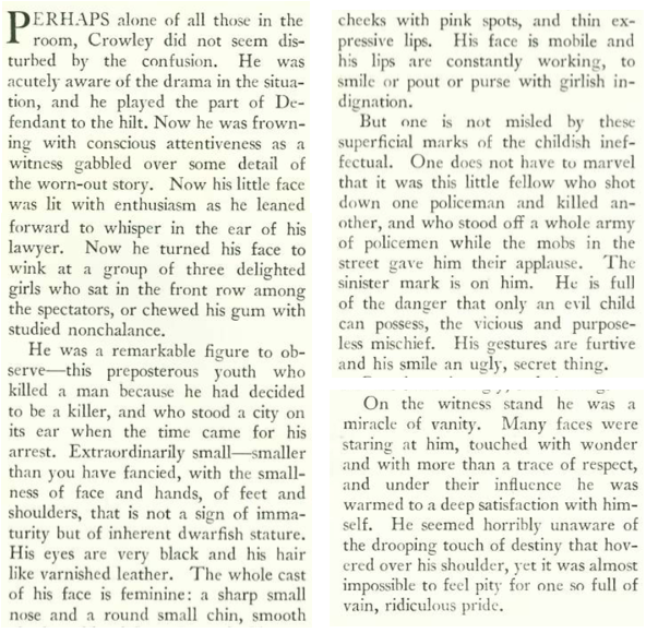 A couple of posts ago I wrote about a very public gun battle that brought diminutive killer Frances Crowley to justice (“The Short Life of Two-Gun Crowley”). In the June 6 installment of “A Reporter at Large,” Morris Markey recounted the courtroom scene where the 18-year-old Crowley winked at girls and nonchalantly chewed his gum as judge and jury determined his fate.