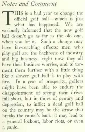 E. B. White lamented in his “Notes and Comment” the changes to the official golf ball, which was to be made slower in a time when Depression-weary businessmen could use a little lift: