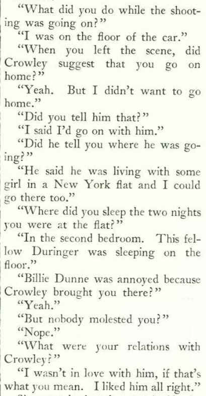 Markey also noted the unseemly behavior of Crowley’s 16-year-old girlfriend, Helen Walsh, who seemed bored by the whole thing. “She was not a creature of your world or of mine,” wrote Markey, who noted at one point that she put her hands to her face “to conceal a faint smile that sprang from some incalculable amusement within her.” Markey offered this sample of Walsh’s questioning.