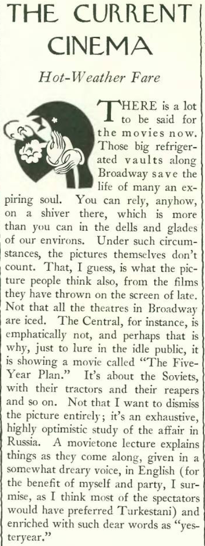 One place you could find an early form of air conditioning was at the movies (critic John Mosher referred to these theatres as “iced), and no doubt many lowered their cinematic standards just to get a few hours respite from the heat. For some unknown reason the Central Theatre thought it could entice audiences not with air-conditioning, but with a Soviet propaganda film titled The Five-Year Plan.