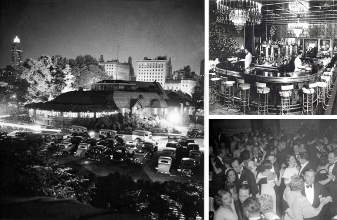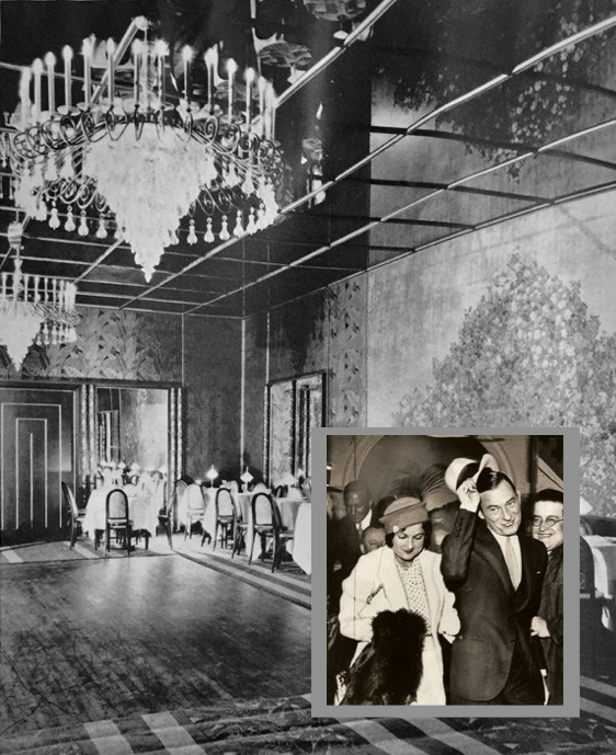 THE BUCK STARTS HERE…It wasn’t a rooftop, but the Central Park Casino was a cool retreat from city streets, especially for Mayor Jimmy Walker, who conducted much of city business there. After reform-minded Mayor Fiorello La Guardia replaced Walker in 1934, Parks Commissioner Robert Moses had the place torn down. (New York City Parks Photo Archive)I COULD HAVE DANCED ALL NIGHT…Mayor Jimmy Walker and his mistress, showgirl Betty Compton, were often the last to leave the Casino in the wee hours of the morning, dancing in the Joseph Urban-designed black-glass ballroom (above) to the Leo Reisman Orchestra. (drivingfordeco.com)