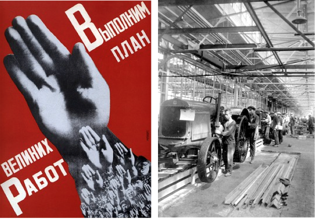 STAY CALM AND CARRY ON…Soviet poster for The Five Year Plan (1930), and a 1930 image of the Volograd (Stalingrad) tractor factory. You wonder how many of those chaps got wiped out by Stalin’s purges, or by the Battle of Stalingrad in 1942-43. (Wikipedia)