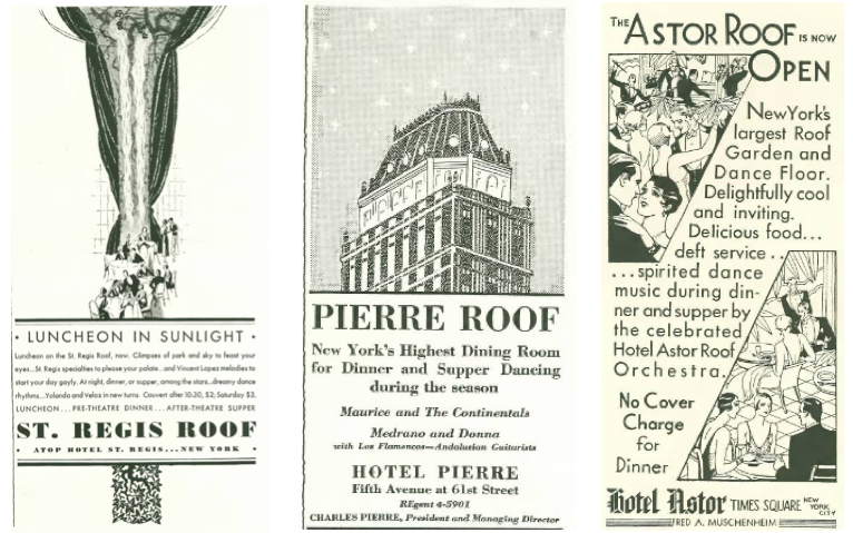 THE COOLEST…Top of the Hotel Pierre. A popular summer ballroom in the years before air-conditioning, the Pierre advertised itself as having “the highest and coolest hotel roof in Manhattan.” (NYT)