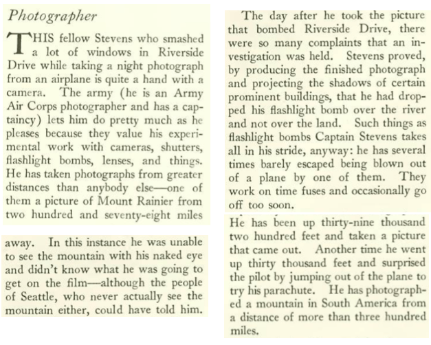“The Talk of the Town” (via E.B. White) looked in on the work of famed aerial photographer Albert Stevens, who back in the day employed the common practice of chucking “flashlight bombs” out of airplanes to illuminate subjects below, including buildings along Riverside Drive that had their windows blown out during one of his aerial photo sessions…