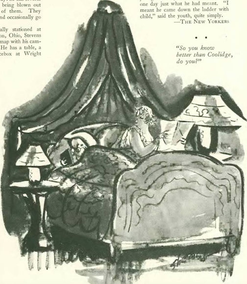 I include this entire page to feature both Garrett Price’s cartoon (Judge Benjamin Barr Lindsey, a leader in abolishing child labor, supported the idea of unmarried couples living together, hence the caption), and Wolcott Gibbs’ thoughts on applying for an advertising position…