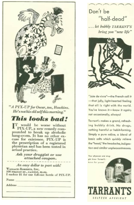 …while cigarette smoking continued to increase in America, the sale of alcohol remained illegal — it didn’t stop people from drinking, and if you got a bad batch of bootleg, or just had too much, there were remedies available…