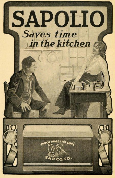 …Bret Harte actually did write jingles for the brand, once described by Time magazine as “probably the world’s best-advertised product” in its heyday. With a huge market share, Sapolio was so well known in the early 20th century that its owners decided they no longer needed to spend money on advertising. It was a poor decision, and by 1940 the product disappeared from the marketplace.