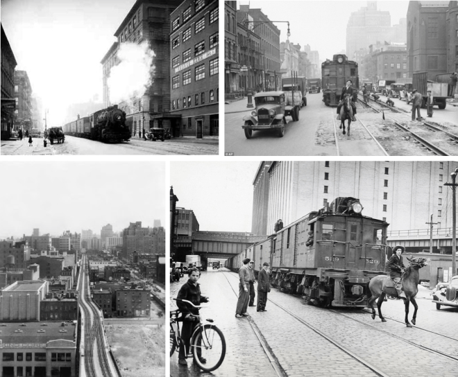 WESTSIDE COWBOYS…Clockwise, from top left, a steam locomotive rumbles down 11th Avenue in the 1920s; a West Side Cowboy William Connolly rides ahead of a train to warn pedestrians in 1932; George Hayde led the final ride of the West Side cowboys up 10th Avenue on March 24, 1941; aerial view of the High Line from 18th Street heading north. Opened in 1934, the High Line lifted most train traffic 30 feet above the street. Today it serves only pedestrians, and is one of New York’s biggest tourist draws. (Forgotten NY/AP/NY Times/thehighline.org)