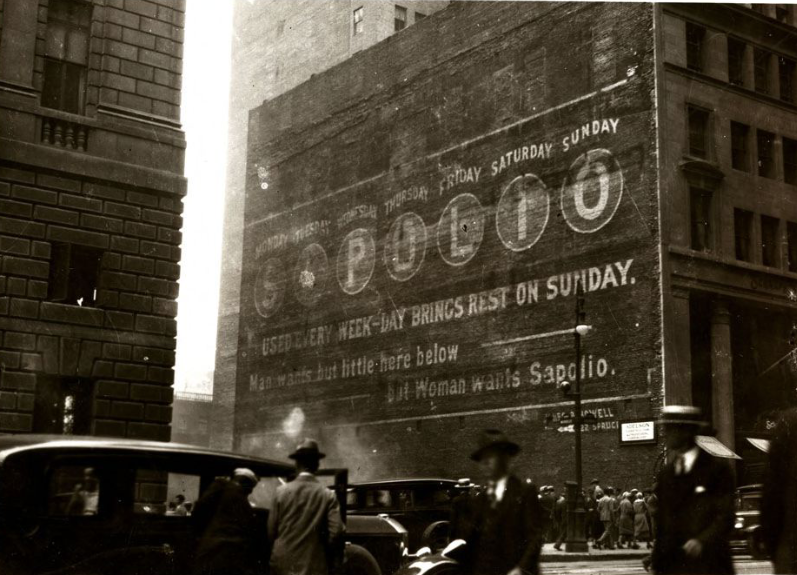 SEEING THE LIGHT OF DAY…A 19th century Sapolio sign on Broadway and Morris Street revealed after an adjoining building was demolished in 1930. (Museum of the City of New York)MONEY WELL SPENT…Sapolio ad from its heyday in the early 20th century. (Pinterest)