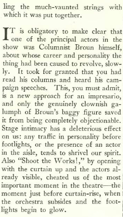 As a charter member of the famed Algonquin Round Table, Heywood Broun was a friend to many of the founding writers and editors of The New Yorker. And so it must have been quite a task to review his play, Shoot the Works, which The New Yorker found wanting in a number of aspects. And because he was so close to Broun himself, Robert Benchley left the review writing to someone who signed the column “S. Finny.” I can’t find any record of an S. Finny at The New Yorker, and I don’t believe this is a Benchley pseudonym (he used “Guy Fawkes” in The New Yorker). At any rate, here is an excerpt: