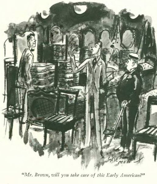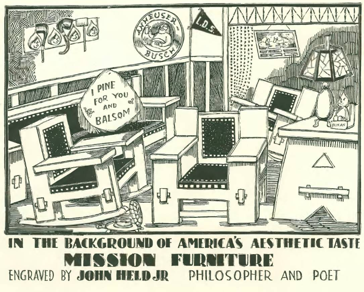 …John Held Jr assessed the aesthetic value of chunky mission-style furniture…