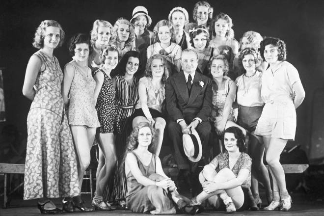 GO WITH THE FLO…Broadway impresario Florenz “Flo” Ziegfeld Jr with his Follies cast, 1931. It would prove to be his last Follies show. Revivals following his death in 1932 would prove to be much less successful. (Wall Street Journal)