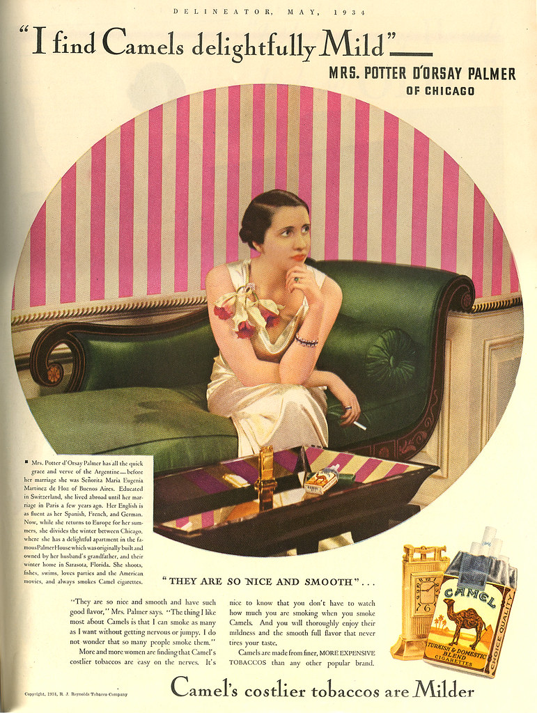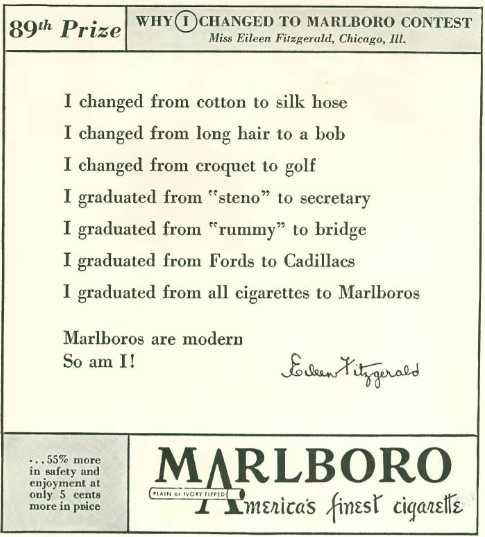 …Maria Eugenia endorsed Camels because they were marketed to women back then, as were Marlboro cigarettes, the makers of which continued their silly handwriting and jingle-writing contests to promote the brand (note the examples “Miss Eileen Fitzgerald” offered of what defined a modern lifestyle)…