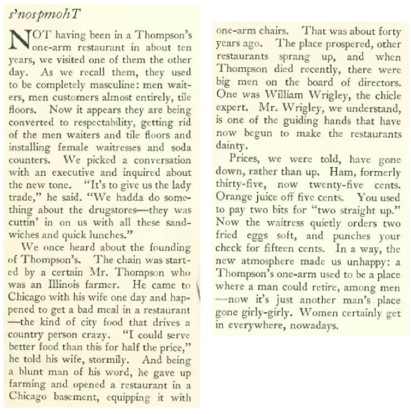If you wanted to get lunch fast and cheap in 1931 you might have stopped at one of John Thompson’s New York restaurants. According to Tom Miller (daytoninmanhattan.blogspot.com), there were no waiters in Thompson’s restaurants. “Customers purchased foods like cold corned beef, cold boiled ham, smoked boiled tongue or hot frankfurters at a counter. They then took their trays to ‘one arm’ chairs lined up along the wall. There were no tables; instead customers ate at what was similar to turn-of-the-century school desks.” E.B. White stopped in for a visit: