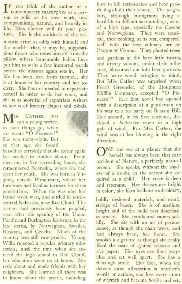 Louise Bogan, in 1931 a new poetry editor for The New Yorker (and a poet herself), wrote a profile of Cather for the Aug. 8 issue. An excerpt: