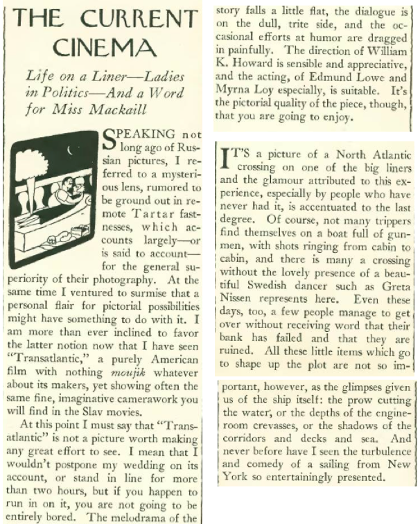 High Seas Hijinks…The pre-code comedy-drama Transatlantic wowed critic John Mosher not so much for its storyline as for its style and cinematography. Clockwise, from left, Edmund Lowe has his hands full with Lois Moran, Greta Nissen and Myrna Loy. (IMDB)NIFTY NOIR…John Mosher loved the avant-garde, noir-ish stylings of Transatlantic. This film by director William K. Howard and cinematographer James Wong Howe is still admired today. A MoMA cinema site notes that the film’s style anticipates Citizen Kane by ten years. (pre-code.com)
