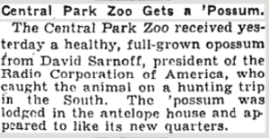 Many zoos back then were more collections of curiosities than places where you could learn about various habitats. So when David Sarnoff, president of RCA, bagged a live opossum in the South, the critter was given a new home in an antelope enclosure, per this item in the Dec. 20, 1931 New York Times: