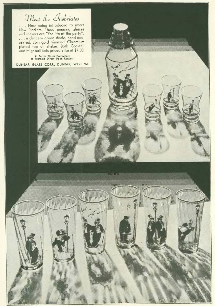 …according to this ad, if you were a “smart” and fashionable New Yorker, then you needed an “Inebriates” themed cocktail set…