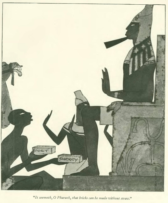 …and Rea Irvin continued to experiment with various motifs, this time an Egyptian-themed cartoon referencing the “wine bricks” sold by enterprising vineyards during Prohibition…