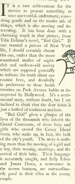 The movies still had nothing to fear from television in 1931, and Hollywood continued to draw large audiences to “Pre-Code” films that featured doses of sex and violence. Novelist Viña Delmar gained famed in 1928 with her suggestively titled book Bad Girl, so when it was adapted into a film, audiences came running—even if the screen adaptation proved to be a bit tamer than the novel that inspired it. Critic John Mosher observed:
