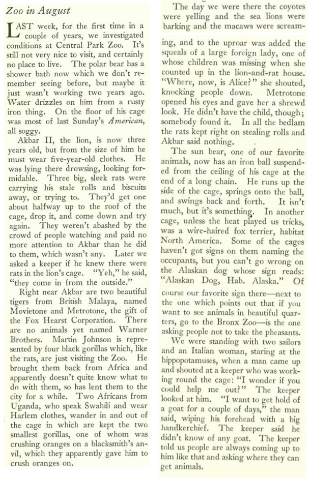 E.B. White paid a visit to the Central Park Zoo, and found it wanting in a number of respects: