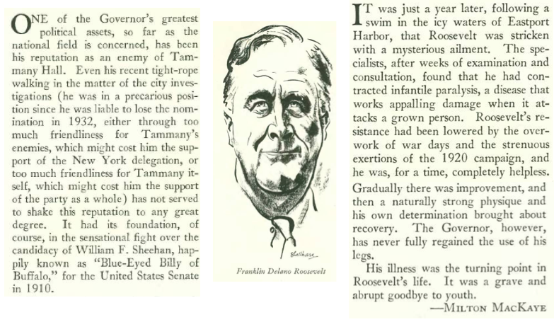 The New Yorker featured two-part profile of the governor of New York, Franklin D. Roosevelt, who unbeknownst to writer Milton MacKaye would soon become the next president of the United States. Two excerpts (not continuous)…