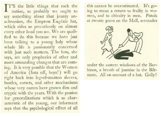 The Empress Eugénie hat was named for 19th century French empress Eugénie de Montijo, who was known as a fashion trendsetter. The hat was revived in 1930 after Greta Garbo was seen wearing a version of one in the popular film Romance. E.B. White was not exaggerating when he noted (in his “Notes and Comment”) that the jaunty hat was seen on “every other head” in the city.